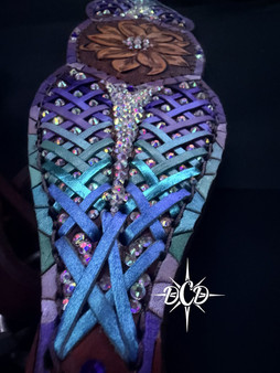 As Shown: Dark Brown leather finish, tooled sunflower center, turquoise to purple shades of la…