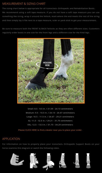 Be sure to measure both the FRONT & BACK fetlocks as they are often different sizes. Customers regularly order boots in one size for the front legs and a different size for the hind legs.