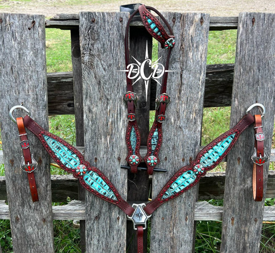 As Shown: dark brown finish, caribbean hornback inlay, red buckstitch, turquoise and red conchos, red thunderbird buckles, one ear headstall.